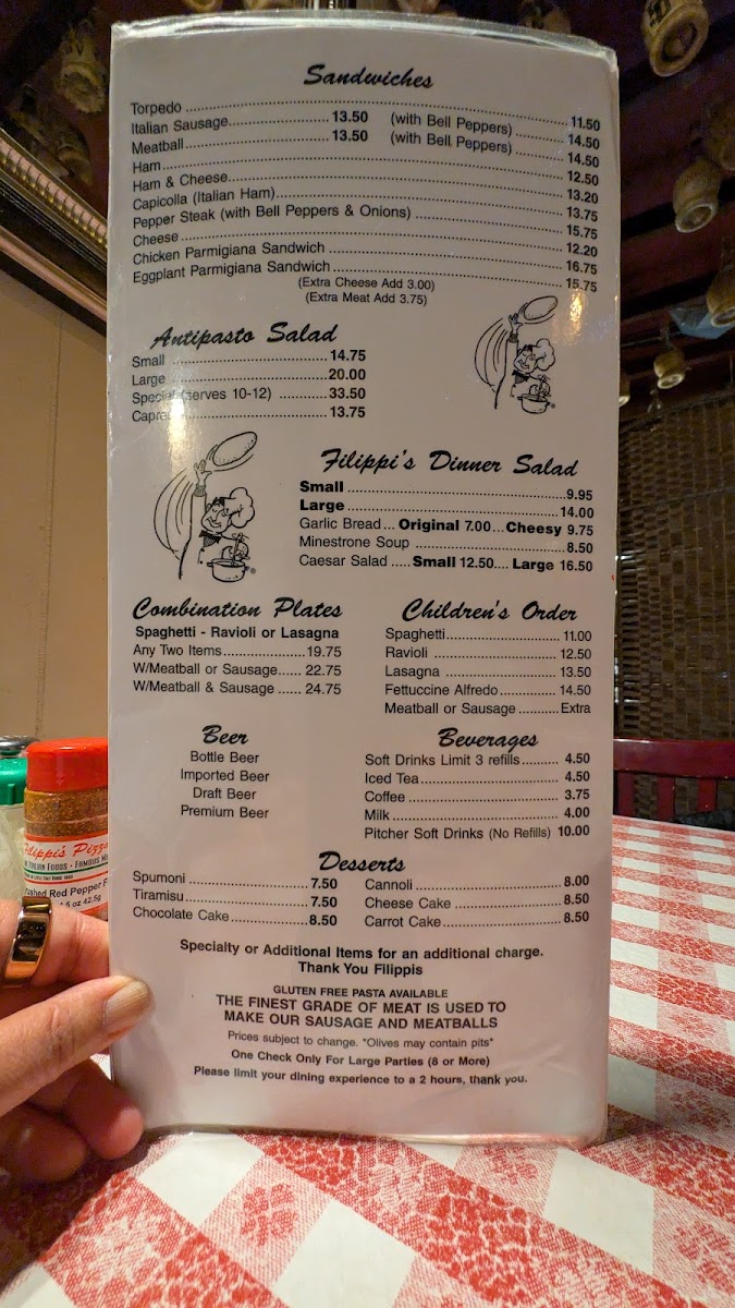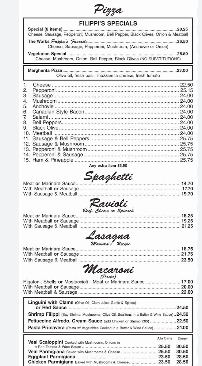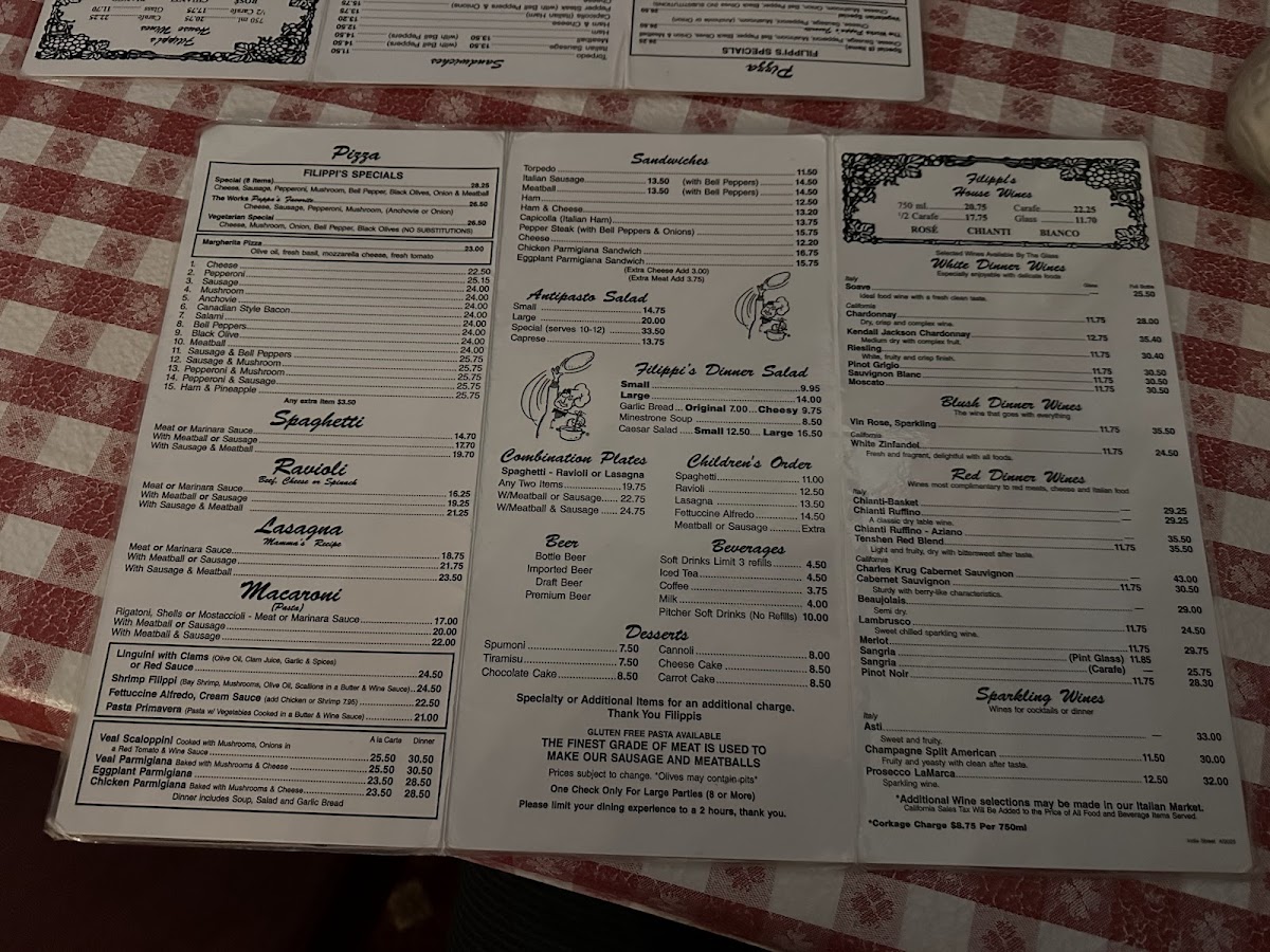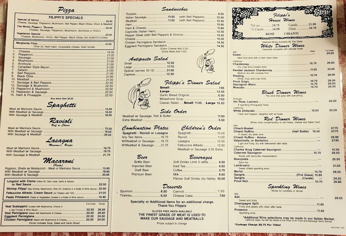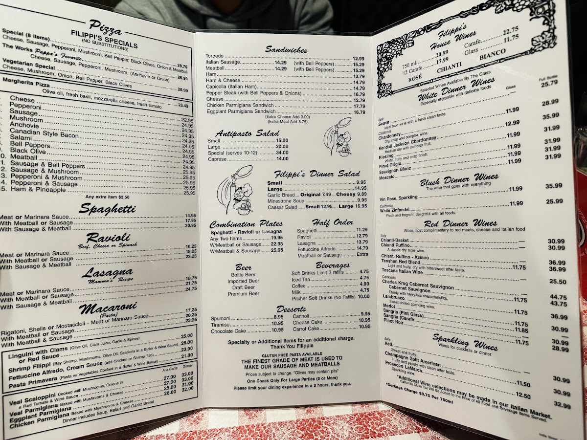 At Filippi's Pizza Grotto in Little Italy, the menu invites you on a delightful journey through classic Italian flavors. Whether you're in the mood for a piping hot pizza with perfectly crispy crust or a rich, hearty pasta, this place has something for every craving. The Filippi's Pizza Grotto Little Italy Menu offers an array of dishes made with fresh, quality ingredients that take you straight to Italy with every bite. From savory appetizers to satisfying entrees, each dish is crafted with love and tradition. Enjoy a selection of homemade sauces, tender meats, and freshly baked pizzas that have made Filippi's a staple in the heart of San Diego. With its warm, welcoming atmosphere and mouthwatering choices, you'll feel right at home, savoring every flavorful moment.